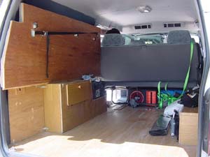 | 床はフローリング剤で板張りにしている。モトクロッサーの泥やウェイク、ウェットなどの汚れも大丈夫。モトクロッサーのタイヤストッパーは取外し式を自作。横にたたんであるのがベッドだが、まだ内張り加工の途中。 安眠希望者(ベッドの詳細) |