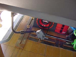 シートをスライドさせるステー。高○さんの手作り。モトクロッサーを積む場合に前にスライドさせ、荷室を広くする。市販のスライドステーはボルトで固定するタイプなので毎回ネジを外さなければならないが、このタイプはネジを緩めるだけでスライドするのでかなり良い。さすが高○さん。 |