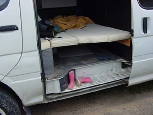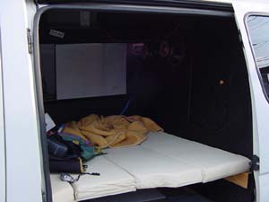 前部の部屋です。ウレタンマットを取外せば従来通りのシートが使用できます。3人は寝れます。 |