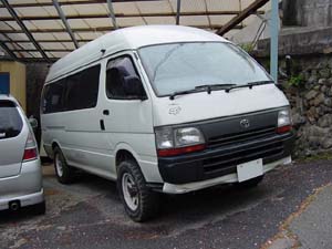 | 高○さんのハイエーススーパーロング4WD−DXです。 マッドタイヤを履いている為、ぬかるんだモトクロス場でもスタック知らず。マニュアル車なので燃費はいいですね(自分のハイエースと比べると)。見るたびに何かが新しくなっている。車いじりが好きなんですね。 |