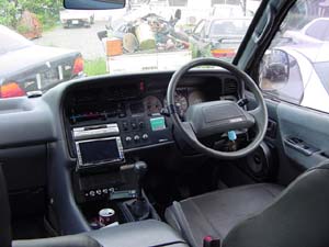 DXなのにパワーウインドウが付いてます。内装もワゴンのと交換。オーディオのスペースをパネルを一部切り抜く事で拡大。3DINになってます。上部にモニター、下部にHDDナビが装備されています。運転席と助手席の間のコンソール内にも後部用のモニターが内蔵されています。 |