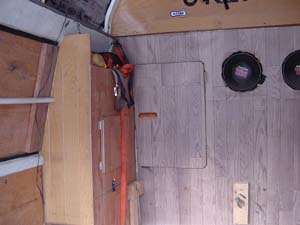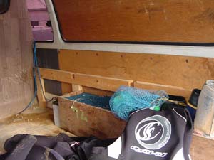 荷室と全室との移動用に小さいドアがついてます。サイドにはオイルなどを格納する収納棚がある。ウーハーも見える。荷室にいると振動で飛び上がりそうです。 |