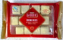 | Lambertz seit 1688 Aachen www.lambertz.de  Dominos Unhüllt mit weißer Schokolade Doppelt gefüllt Dez. 2016  | Lambertz seit 1688 Über 330 Jahre Backtradition Aachen www.lambertz.de  Aachener Dominos mit Zartbitterschokolade, Doppelt gefüllt Jan. 2025  | Lambertz seit 1688 Über 330 Jahre Backtradition Aachen www.lambertz.de  Dominos mit weißer Schokolade, Doppelt gefüllt Okt. 2025  | |
