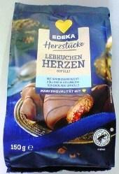 Edeka Hamburg ![]() Lebkuchen Herzen Zartbitter umfüllt mit 23% Zartbitterschokolade und mit 3% Vollmilchschokolade verziert Okt. 2023 |